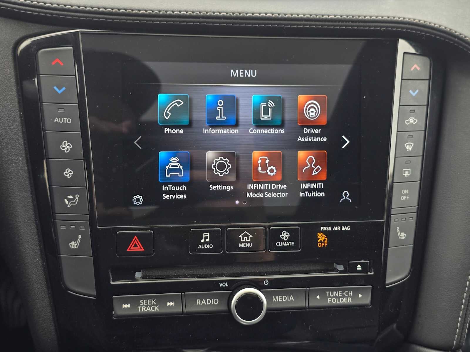 - Radio: AM/FM/CD Audio System -inc: 6 speakers, 4 USB connection ports, Apple CarPlay and Android Auto, dual display system w/upper 8" and lower 7" HD touch screens, INFINITI voice recognition, HD Radio technology, SiriusXM radio w/advanced audio features w/3-month complimentary trial, streaming audio via Bluetooth®, Bluetooth® hands-free phone system, Siri eyes free, hands-free text messaging assistant, active noise cancellation, WiFi hotspot, automatic collision notification and emergency call