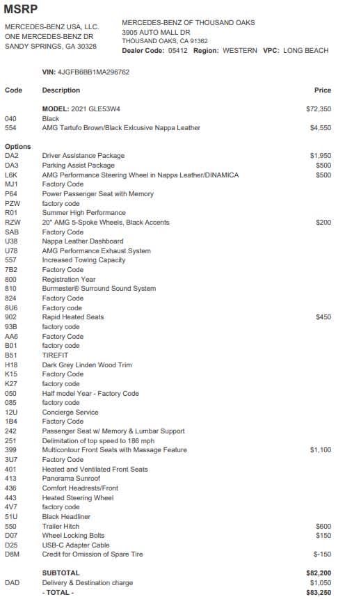 DRIVER ASSISTANCE PACKAGE PLUS Active Stop & Go Assist, Active Lane Change Assist, Active Emergency Stop Assist, Route-Based Speed Adaptation, Evasive Steering Assist, PRESAFE® PLUS Rear End Collision Protection, Active Distance Assist DISTRONIC®, Active Steering Assist, Active Brake Assist w/Cross-Traffic Function, Active Blind Spot Assist, Active Lane Keeping Assist, Active Speed Limit Assist, Traffic Sign Assist, POWER TILT/SLIDING PANORAMA SUNROOF, TRAILER HITCH Increased Towing Capacity, PARKING ASSISTANCE PACKAGE Parking Package w/Surround View Camera System, Surround View System, AMG® PERFORMANCE STEERING WHEEL IN NAPPA/DINAMICA, HEATED & VENTILATED FRONT SEATS, RAPID SEAT HEATING, PASSENGER SEAT MEMORY, HEATED STEERING WHEEL, WHEELS: 20 AMG® 5-SPOKE W/BLACK ACCENTS, Navigation, Full-Time 4MATIC® All-Wheel, Power Liftgate, Premium Sound System, Satellite Radio Exchange Privilege for 7 days or 500 miles, whichever comes first, Each Certified vehicle must pass a rigorous inspection of over 165 points, 24-Hour Roadside Assistance includes trip routing, trip interruption coverage and technical help, A network of over 300 Mercedes-Benz dealers will support your Certified Mercedes-Benz, Carfax Vehicle History Report, Balance of New Car Warranty plus 1 year/unlimited miles extended Limited Warranty Mercedes-Benz of Thousand Oaks is your local Mercedes-Benz dealership, serving the Thousand Oaks and Los Angeles Metro area since 1982. Our showroom always includes the most current luxurious and sophisticated Mercedes-Benz models. Were only a short trip from many communities, including Malibu and Simi Valley, and our team is happy to provide sales, financing, and automotive service and repair on site.