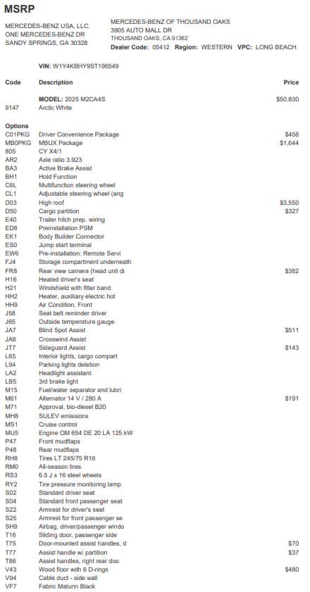 HIGH ROOF, MBUX PACKAGE: Pre-Installation for Navigation, Instrument Panel Front-to-Rear Outlet, Radio: MBUX Multimedia System w/10.25 Touchscreen, Smartphone Integration Package, Acoustic Package, BLIND SPOT ASSIST, WOOD FLOOR W/6 D-RINGS, DRIVER CONVENIENCE PACKAGE: Hinged Lid for Left & Right Storage Compartments, 2 Additional Master Keys, Electrically Folding Exterior Mirrors, Driver Seat Base 12V Power Outlet, ATTENTION ASSIST®, Hinged Lid for Storage Compartment, REAR VIEW CAMERA W/HEAD UNIT DISPLAY, CARGO PARTITION, GREY REAR BUMPER STEP, Heated Driver Seat, Diesel, Remote Engine Start, Heated Seats Mercedes-Benz of Thousand Oaks is your local Mercedes-Benz dealership, serving the Thousand Oaks and Los Angeles Metro area since 1982. Our showroom always includes the most current luxurious and sophisticated Mercedes-Benz models. Were only a short trip from many communities, including Malibu and Simi Valley, and our team is happy to provide sales, financing, and automotive service and repair on site.