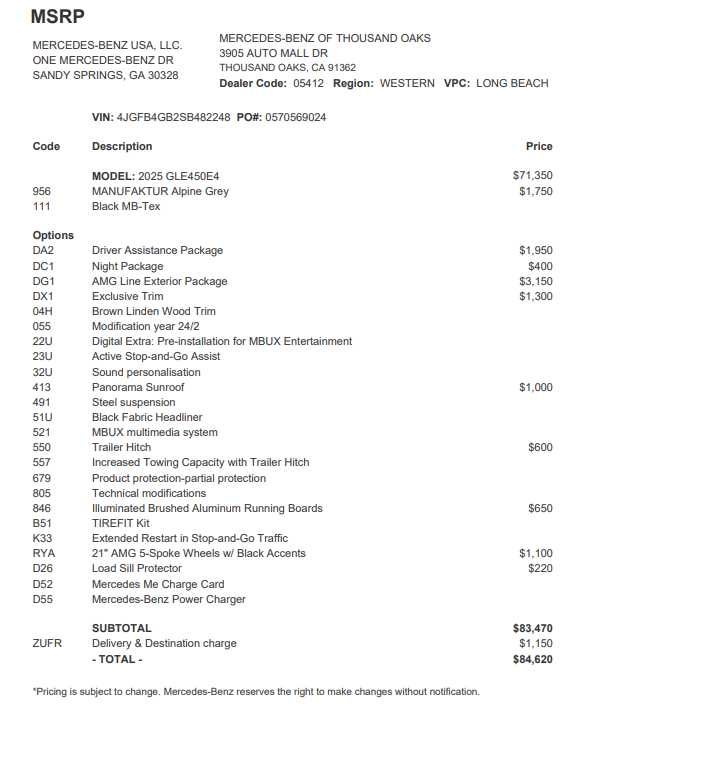 DRIVER ASSISTANCE PACKAGE Active Lane Keeping Assist, Active Distance Assist DISTRONIC®, Active Steering Assist, Active Speed Limit Assist, Extended Restart in Stop & Go Traffic, Active Lane Change Assist, Route-Based Speed Adaptation, EXCLUSIVE TRIM Ventilated Front Seats, Burmester® Surround Sound System w/Dolby Atmos, 13 high-performance speakers, 9-channel DSP amplifier w/590-watts output and Frontbass, Music Streaming, Sound Personalization, WHEELS: 21 AMG® TWIN 5-SPOKE W/BLACK ACCENTS Tires: 275/45R21 Fr & 315/40R21 Rr, TIREFIT, PANORAMA POWER TILT/SLIDING SUNROOF, ILLUMINATED RUNNING BOARDS, TRAILER HITCH Increased Towing Capacity, Navigation, Full-Time 4MATIC® All-Wheel, Power Liftgate, Back-Up Camera, Turbocharged Exchange Privilege for 7 days or 500 miles, whichever comes first, Each Certified vehicle must pass a rigorous inspection of over 165 points, 24-Hour Roadside Assistance includes trip routing, trip interruption coverage and technical help, A network of over 300 Mercedes-Benz dealers will support your Certified Mercedes-Benz, Carfax Vehicle History Report, Balance of New Car Warranty plus 1 year/unlimited miles extended Limited Warranty Mercedes-Benz of Thousand Oaks is your local Mercedes-Benz dealership, serving the Thousand Oaks and Los Angeles Metro area since 1982. Our showroom always includes the most current luxurious and sophisticated Mercedes-Benz models. Were only a short trip from many communities, including Malibu and Simi Valley, and our team is happy to provide sales, financing, and automotive service and repair on site.