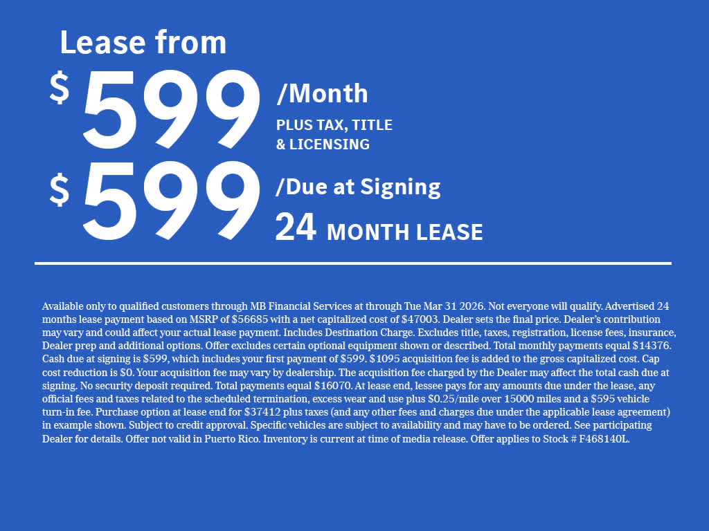 “A 2.25% surcharge is applied to all credit card transactions. This fee is not greater than our cost of acceptance. There is no fee for debit card payments.” **The charging voucher is subject to the program terms of Mercedes-Benz USA’s service provider ChargePoint, which are presented to the customer when the Mercedes me Charge service is activated. All MY25 BEV customers, excluding eSprinter, also receive 2 years of free unlimited charging at Mercedes-Benz High Power Charging (“MB HPC”) network; those charging sessions are always free during such 2-year period and are therefore not covered by the $1,000 charging voucher if selected. However, idle fees incurred at MB HPC stations are the responsibility of the customer and will be charged to the customer’s Mercedes me Charge account, which could be covered by either a valid payment method associated with the account or the balance of the charging voucher. The offer is non-refundable, non-transferrable, and non-cancelable once a selection has been made and has no cash value. Additionally, the offer is subject to change and may be discontinued at any time.